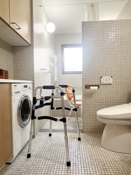 この度新たに取り付けたL型手すり、このおかげで歩行補助器からバスチェアに自分で移動ができ、立ち上がることもできました。