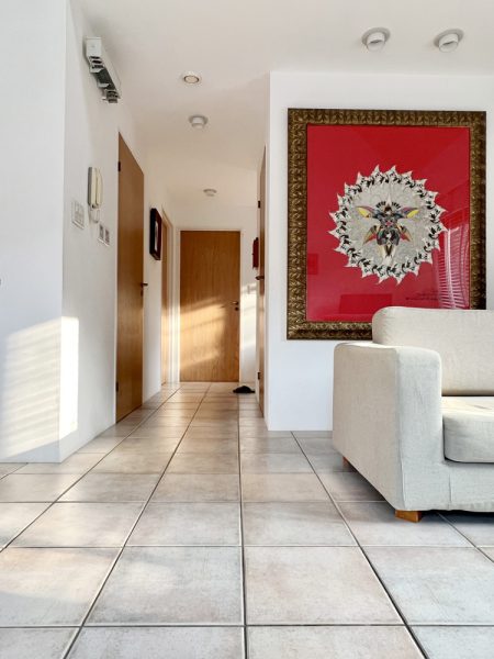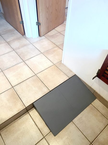 玄関土間と1階床レベルの間に10 cmの段差があるのみ、ここには車椅子の為にレンタルでスロープを置きました。