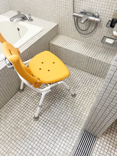 父の場合、このバスチェアで自分で髪の毛も体も洗えるのですが、唯一足(ひざから下)は自分で洗えないから洗ってあげて下さいと病院の方から言われていましたが、なんと父がこの段に足を乗せて自分で全部洗えたとたいそう喜んで教えてくれました。こうしたことが父に自信を与え気持ちをポジティブにしているとそばに居て感じました。